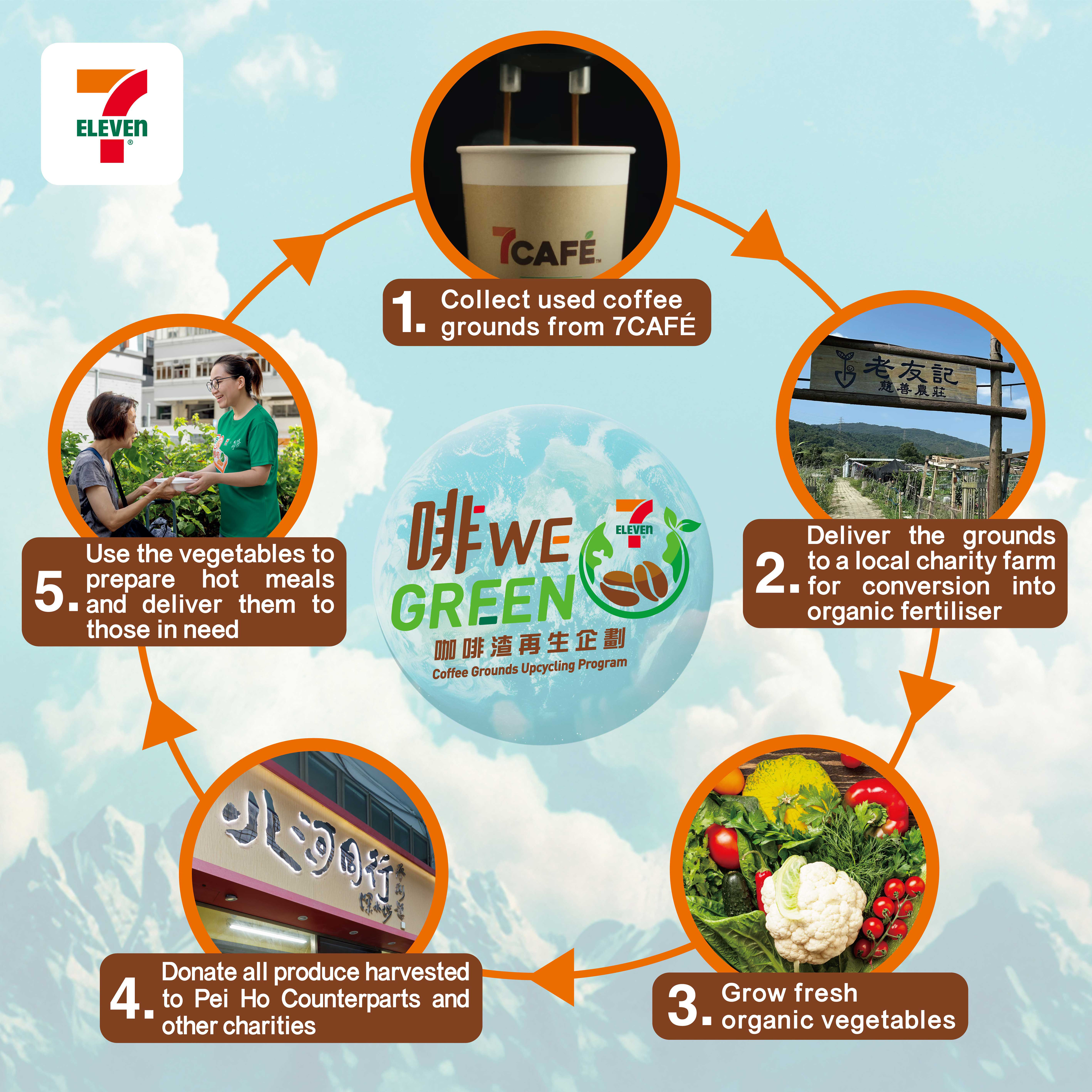 As Hong Kong’s biggest coffee retail network, 7CAFÉ is committed to serving convenient, affordable, freshly brewed coffee – while caring for the planet by supporting food-waste recycling. With support from Foodlink Foundation, used 7CAFÉ coffee grounds are collected and delivered to Senior Buddy Charity Farm, where food-waste composters turn them into natural fertiliser. The farm grows seasonal vegetables that are donated to ten charitable organisations across Hong Kong – including our long-term partner Pei Ho Counterparts, as well as Foodlink Mart, OIWA (Outlying Islands Women’s Association), J Life Foundation, Little Sisters of the Poor St. Joseph’s Home for the Aged, Jockey Club Kwun Tong Community Hub and Caritas Community Centre – Ngau Tau Kok. Many of these organisations use the produce to prepare hot, nutritious meals for people in need, including the homeless, elderly people living alone and low-income families.