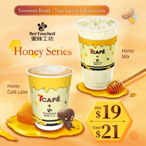 Following the popular previous collaboration series, 7CAFÉ has once again teamed up with the Taiwanese brand BeeTouched to launch two fan-favorite honey drinks: 7CAFÉ +BeeTouched Honey Café Latte and 7CAFÉ+BeeTouched Honey Milk*.