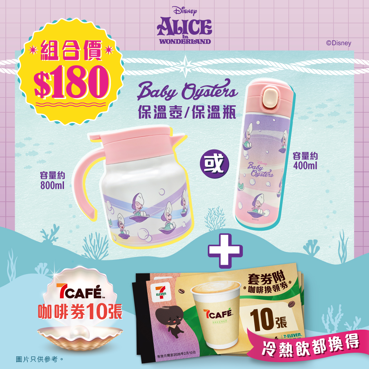 由 即日起至2026年1月27日,以組合價$180即可購買「7CAFÉ咖啡套券」一本(內附咖啡換領券十張)*,及Baby Oysters保溫壺或保溫瓶一個。款式可自由選擇,數量有限,先到先得,粉絲們絕對不可錯過!一套10張7CAFÉ咖啡換領券可以有效期內換領任何口味的7CAFÉ即磨咖啡(聯乘產品除外),熱飲或凍飲均可。即磨咖啡由100%雨林聯盟認證Arabica咖啡豆沖製,於香港新鮮烘焙,帶給你7-Eleven獨有咖啡滋味。優惠期有限,粉絲們記得入手,讓Baby Oysters爲冬季帶來陣陣暖意!