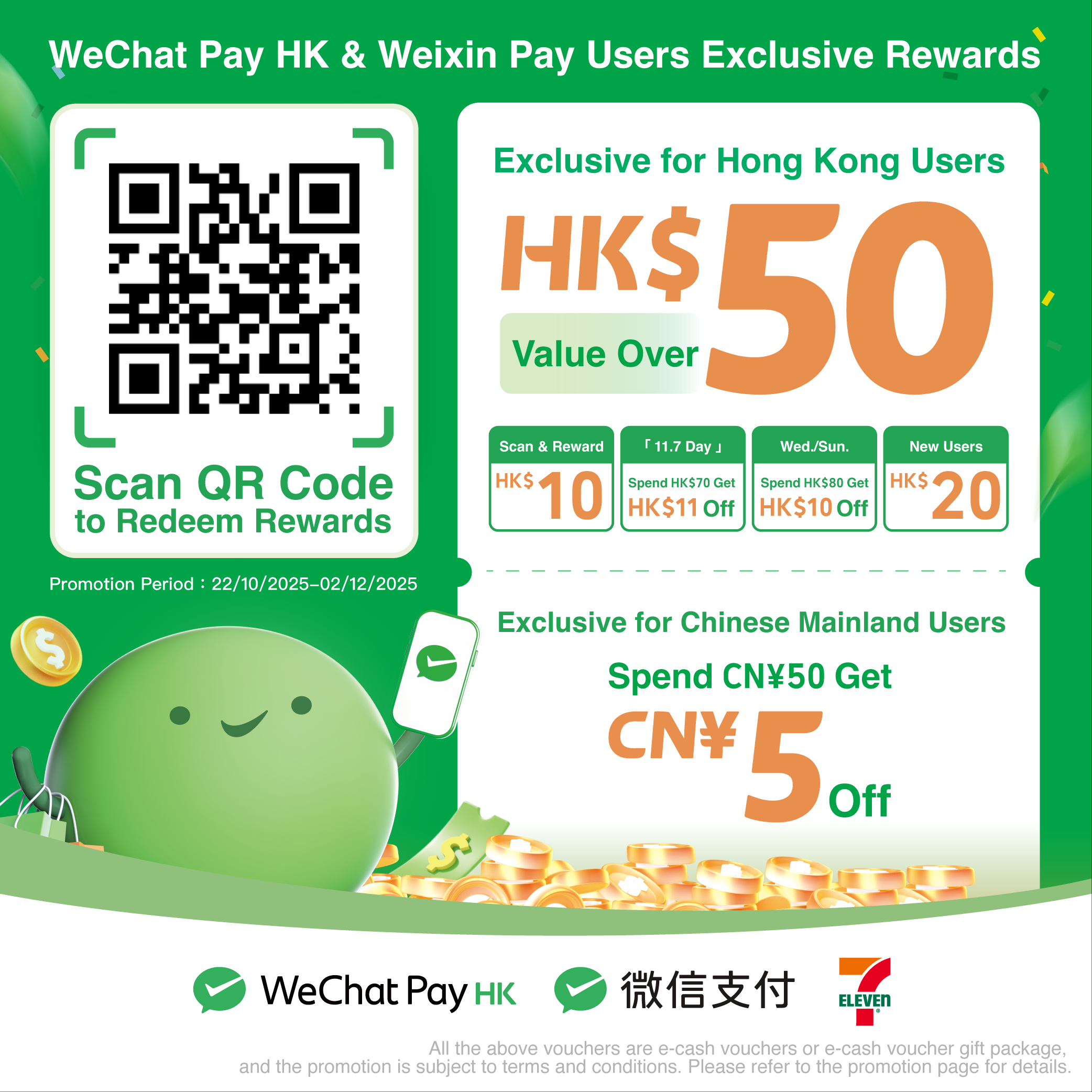 From now till 2 December 2025, WeChat Pay HK users scan QR to redeem electronic vouchers valued over HK$50*